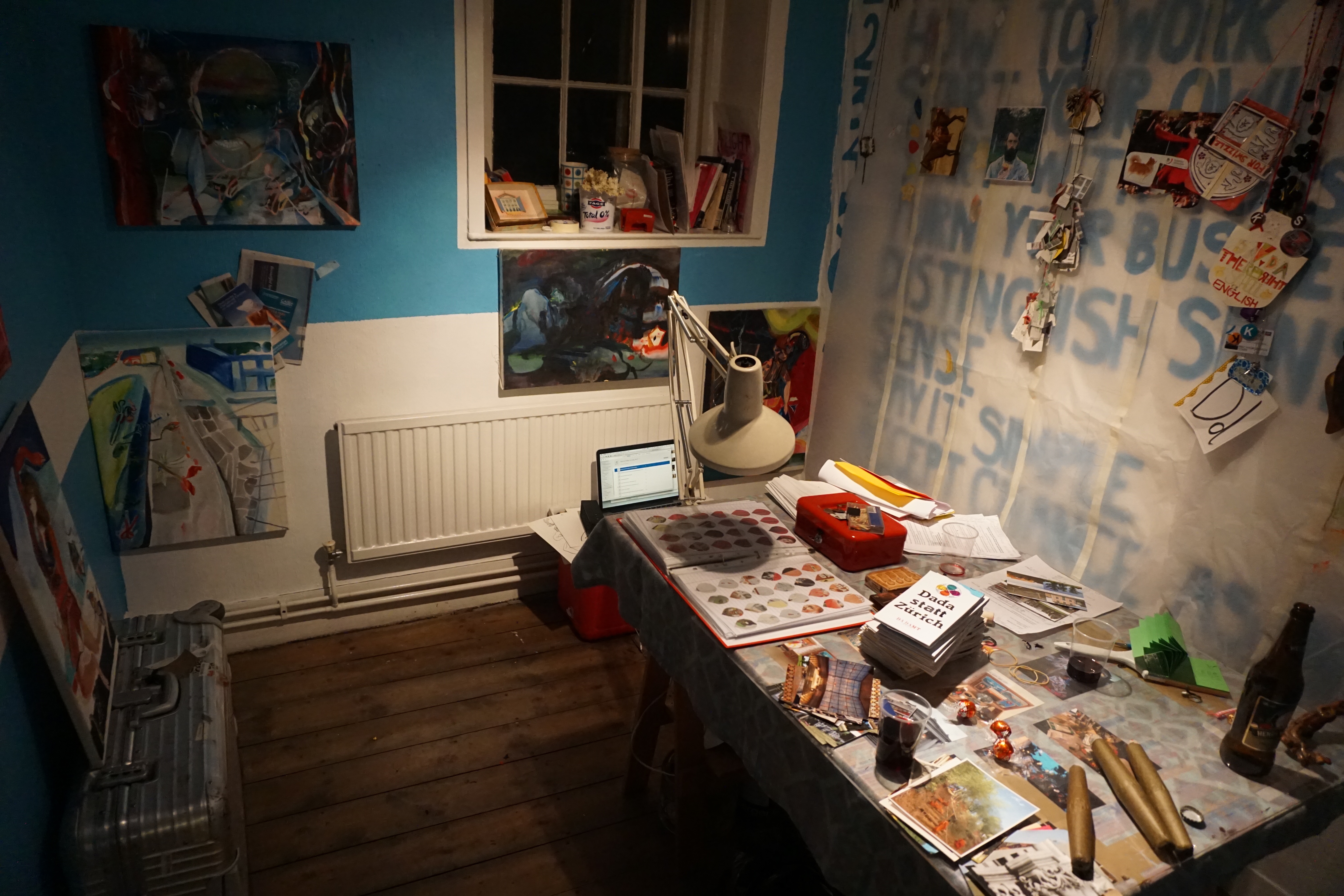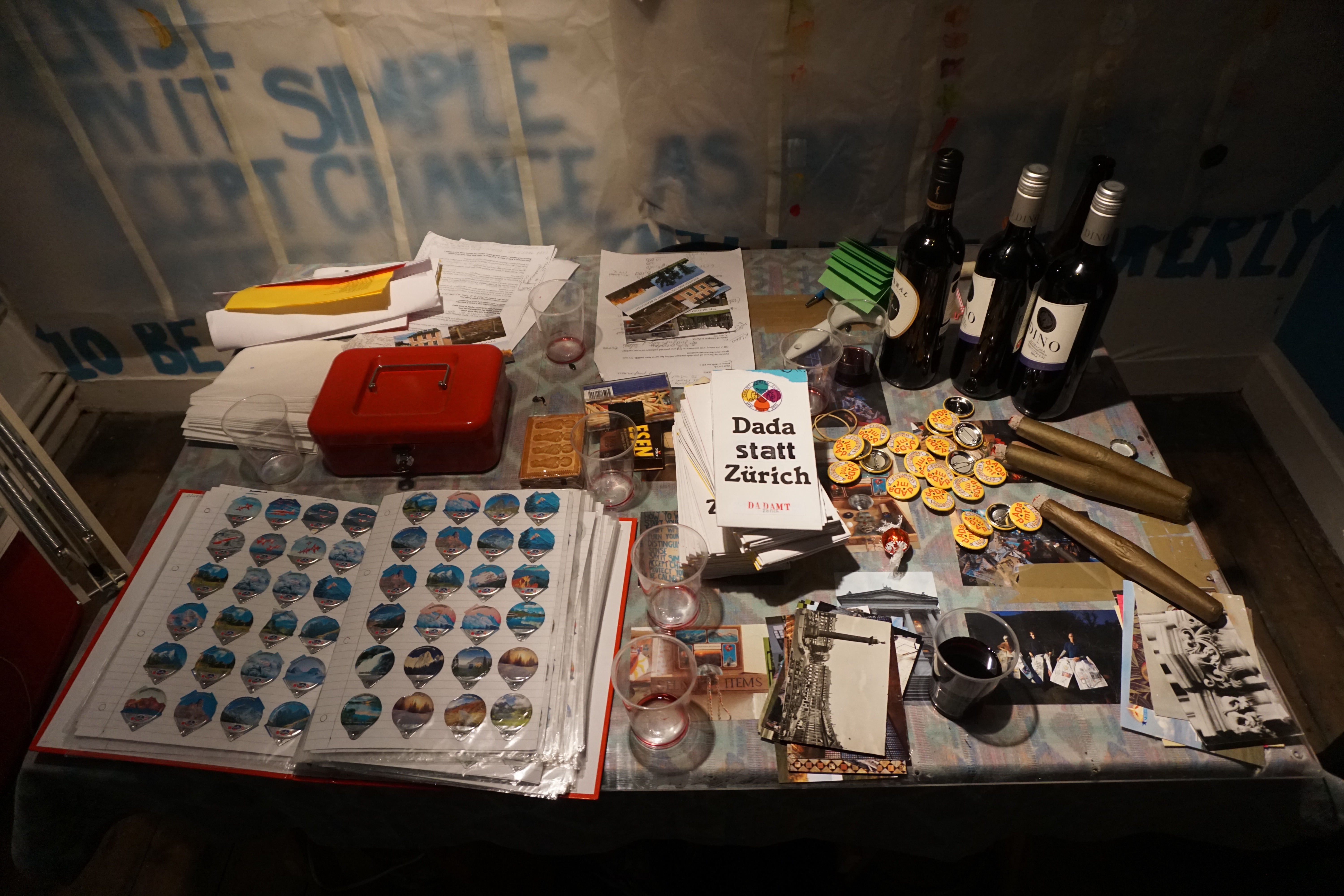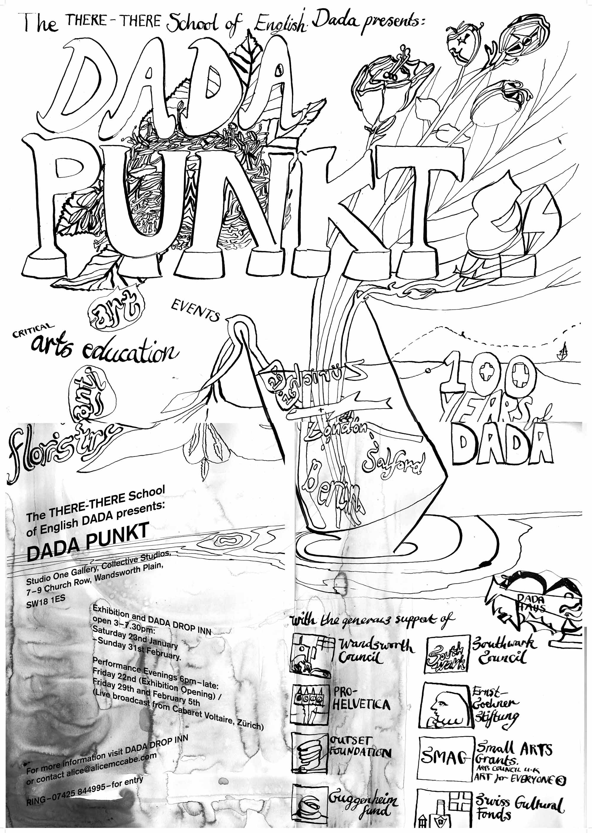 January – February 2016: DADA PUNKT and DROP INN, An exhibition and open platform in London from which to contemplate the centenary of dada Studio One Gallery, Collective Studios, Wandsworth. Using art, anti-art, arts education, performance, floristry and other rogue business ideas to consider dada scenes 1916 – 2016, the 100 year gap and connect with the official celebrations in Zurich. The title DADA PUNKT or dada point refers to these connections in both space and time (and the vastness beyond them) whilst creating a physical place in which to assemble. DADA package holidays offered from the DADA TRAVEL BURO Swiss Tourisme 2016, with hot curatorial extras including avoiding the curators of Manifesta, non-sharp gipfeli and pre-packed costumes for the Kunsthaus DADA costume ball.