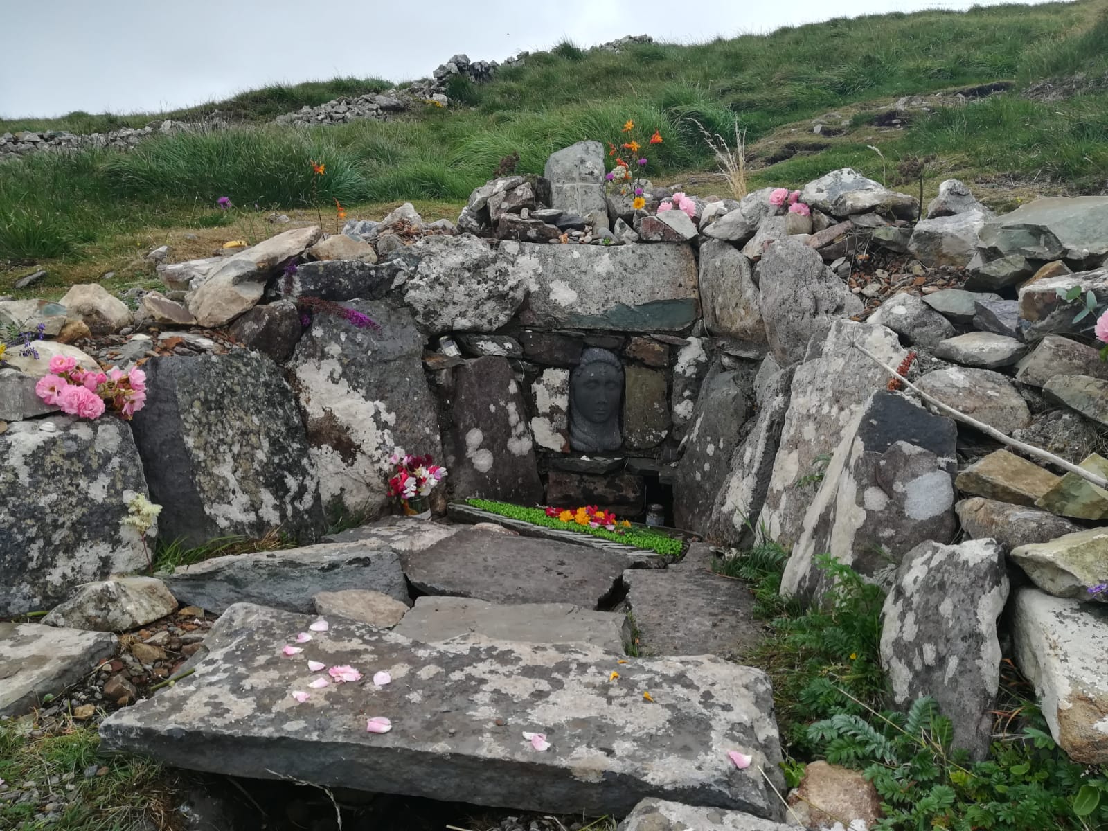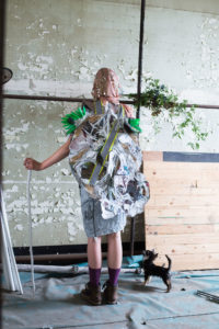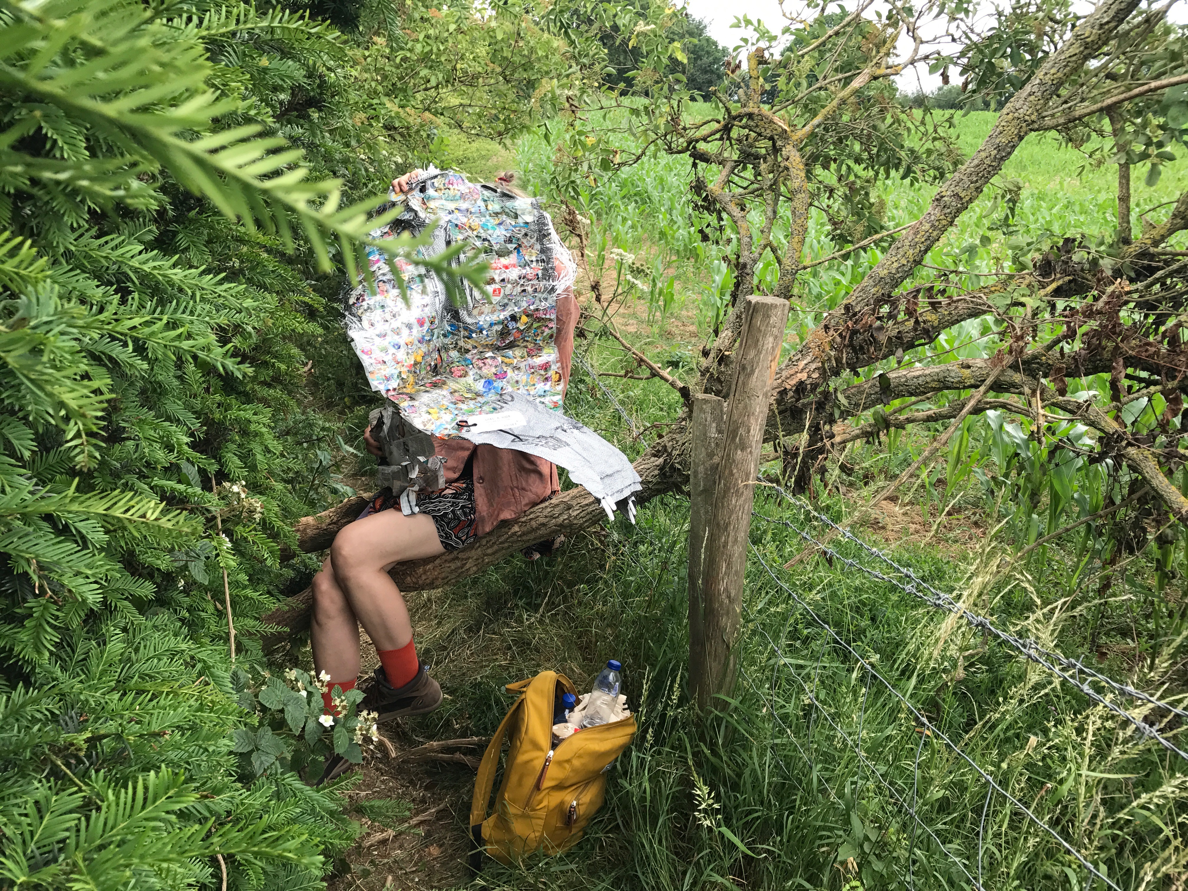 ongoing // floral pilgrimageOver the last three years I have been creating costumes designed for everyday living or survival in London. These have mainly taken the form of newspaper costumes, including an outfit made from icons from an app designed to help you save money, a floppy paper suit of British armour and tassels developed for attachment to a cloak or shield designed to both represent and ward off fears concerning Brexit. These can be seen under newspaper city props and marlon brando island videos. “Heraldry is a study which loads the memory without improving the understanding.” Herald Peter Le Neve, 1696 (From Ann Payne, Medieval Heraldry.) My latest costume is an evolving pilgrimage suit that I started work on in Summer 2017 in connection with a series of workshops and commission Floral Heraldry for a cabinet space at PEER Gallery. Milk tops from a collection of mine from Switzerland (where I used to live and perform as “The THERE-THERE School of English Dada”) have been insulated with tape and pinned onto a British mail sack. The Milk Tops fascinate me as elements of ‘home’ culture and national identity are highlighted: alpine festivals, Swiss wrestling, Albert Anker children, alongside more exotic themes of tropical fish, or beautiful ever stereotypical holiday destinations in abroad. An atrophied absurdity and rupture; these mini milks would have been consumed in a moment perhaps unnoticed, possibly far away from the symbolism of the image, creates an adjunct that interests me and this costume aims to extend from the UK. I built a suit of these images connected to pictures I felt were both protective and reflective of my character, including many flowers as a chainmail of everyday events and sights which I could then add to, cutting out extra meaning to be left with flippant politics of packaging. My first walk was in 2017 with my father from Gravesend to Canterbury along sections of the Pilgrim’s Way. I was interested in observing the landscape of British flowers from the perspective of a floral artist, recording the seasonal differences and commonalities between flowers available at the market and grown in the fields loosely on the London to Holland flower-route. Using images from the walk I hand cut my own milk tops attaching them into the costume to replace damaged or worn patches with British seasonal flowers and sights. Between 2017- 2018 I started a collaboration together with artist and educator Amy Ash, this time contemplating both physical and political changes to the landscape. We were drawn to walking around Holyhead, an island protruding off Wales, in alternative directions retracing the steps of St. Cybi and St. Seriol. One Saint who faced the darkness, the other the light which felt like a dualistic coping metaphor for the political horizon. This follows a period of dark reflection as Amy although married to a Londoner was nevertheless coerced into leaving London due to visa issues and so I walked in her place during Summer 2018, exploring sites of importance as either St. On this walk for each holy spot (assessed by both site and feeling) I would document both the landscape and myself in it, to create a more embodied response of the situation on the Island as something transferable to her. Then using snack bar wrappers, local pamphlets and these images, I sent her a map-place of the Island, something to both peruse and wear / physically enter. In Ireland after leaving Anglesey, I then visited the outer most promenentray where rough tar lined boats would have sailed to the Americas. Together with my former colleague Alice Benetti who moved to Ireland, Dingle last year to grow flowers we created a tribute to St. of the Bees. We then traced the blessing with the same line of the necklace down to the waterfront to connect with Amy. Later in the Summer I visited Ameno, Northern Italy on invitation of my friend St. Pauli who runs DADA Paradiso and with whom I used to perform at his Soiree Surprise at Cabaret Voltaire. It took twenty five days to walk there and en route I collected samples of weeds, photographs of wildflowers and small cuttings of foliage encountered from the roadside. As I entered the small village the landscape seemed to become increasingly moist green and lush, and I began to notice spiral symbols chalked onto buildings. The only condition of the residency is that you have to perform, so I chose to combine the spiral – symbol of pataphysics – and cuttings, attempting to use them as a form of direct news from the landscape by rolling them in ink, pressing them into cone like bouquets of tabloid shaped paper before reading them with the public at the local wash basins. 2019 – After my biggest ever commercial job as a floral artist in 2019, creating seven large hanging installations and complimentary tablecentrepieces within an arena, it felt like time to turn an eye to the flower industry… Part in awe of being able to work with flowers from across the world in February but also to better consider how they were transported / grown and what the commercial / economical implications of these movements are… And it was eye opening! I travelled together with fellow florist, Liz and pal Carol. We coursed the flower route travelling down from Haarlem to Leiden, looking at the tulip fields, before moving inwards towards the Royal Flower Market and glasshouse Venice: Naaldwijk. The biggest shocks for me were the level of visible wastage between the glass lit passages (highest light pollution in world here) and price of flowers at the market. The market is like a disco: people and flowers zipping around to pop music. Big canteen beckons if you’re in a fluorescent vest. Inside one of the two auction rooms, flowers and flashing circles whizz into action and it’s impossible to follow. The next step on the route was a residency organised by Wim Wauman bringing together a selection of artists whose practices all contained or operate clos